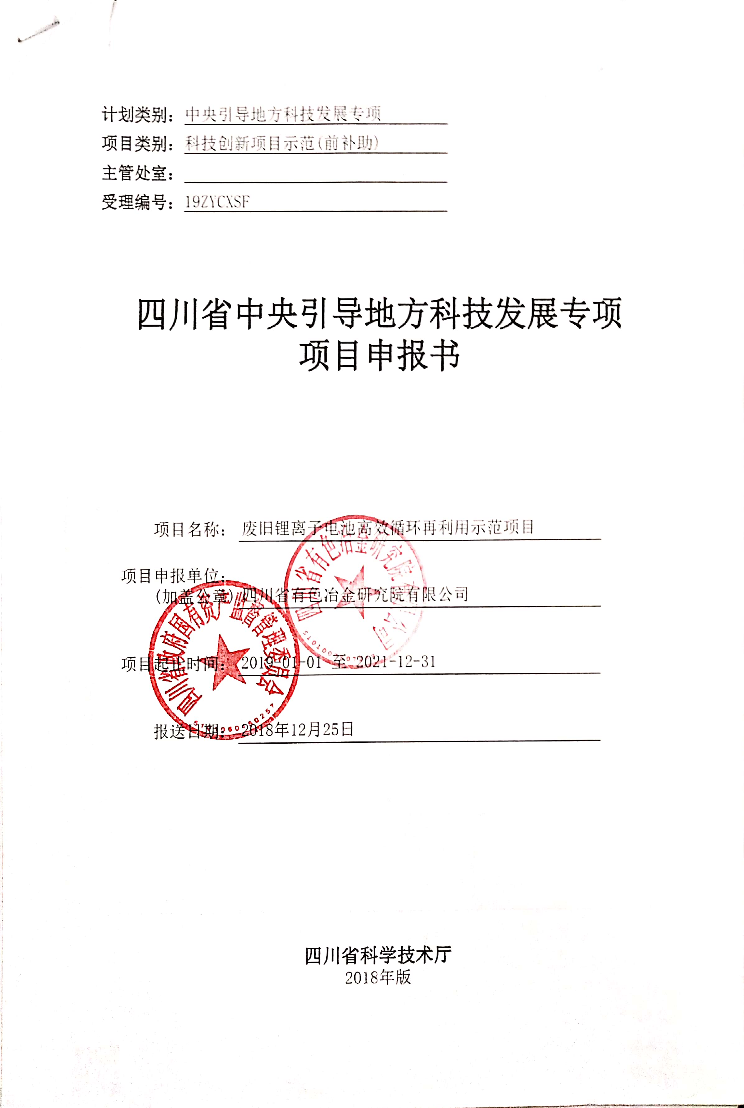 2019年9月19日,從四川省科技廳獲悉,开云体育所屬四川省有色冶金研究院有限公司成功獲批2019年中央引導地方科技發展專項項目——《廢舊锂離子電池高效循環再利用示範項目》,這是繼2018年9月四川省有色冶金研究院有限公司獲批國家生态環境部重大科技專項——《第二次全國污染源普查項目》後,再獲中央資金項目,标志着省有色科技集團在承擔國家級重大科研項目上取得新突破。
