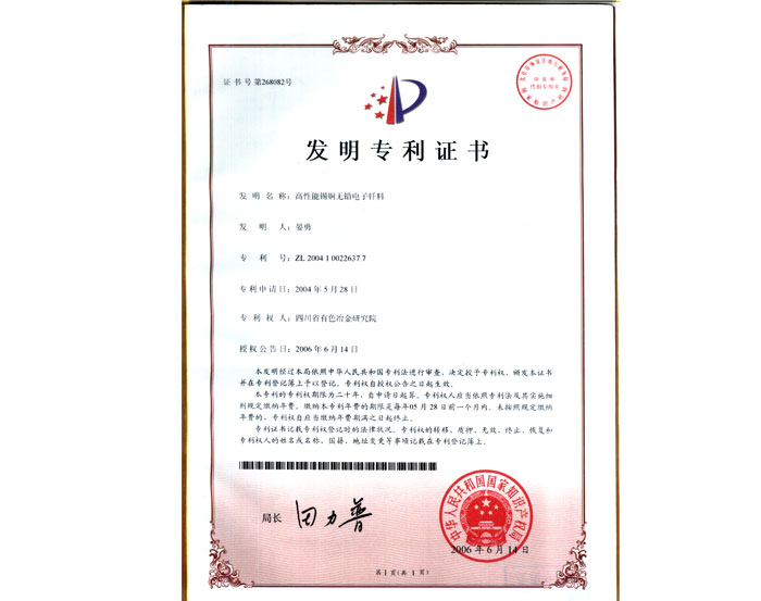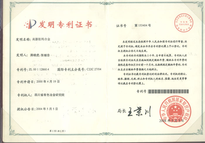 高膨脹鎢合進專利發明證書