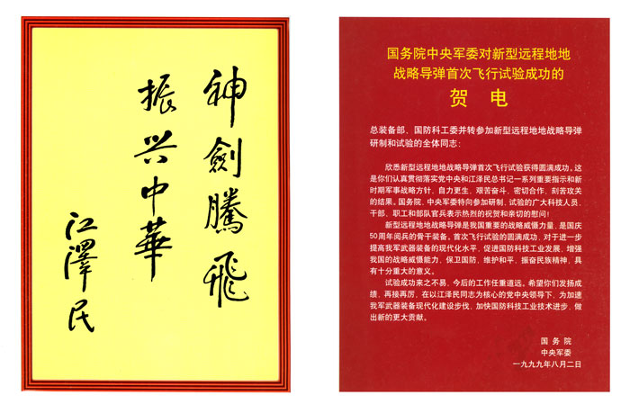 江澤民題詞及國務院中央軍委賀電