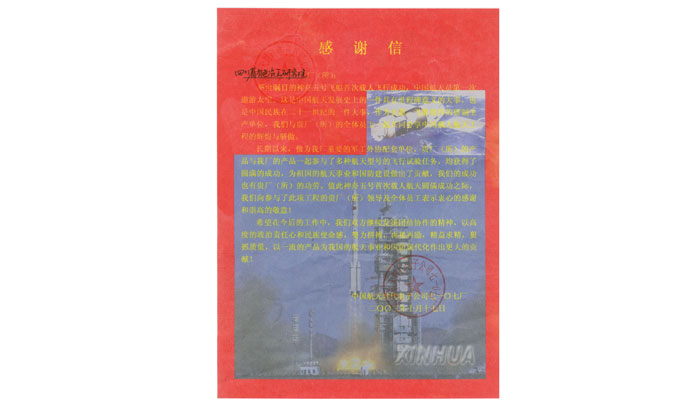航天時代公司神五飛船首飛後感謝信