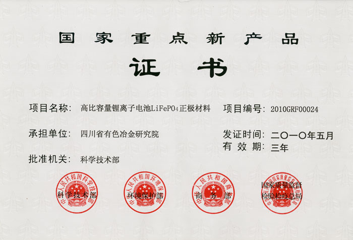 高比容量锂離子重點新産品證書